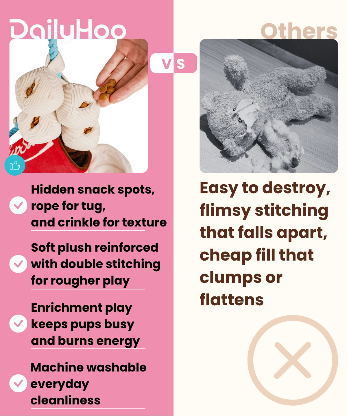 Dogs love chewing on the rope, snuggling the plush, and hunting for hidden treats inside. It keeps them busy, happy, and coming back for more fun every day.