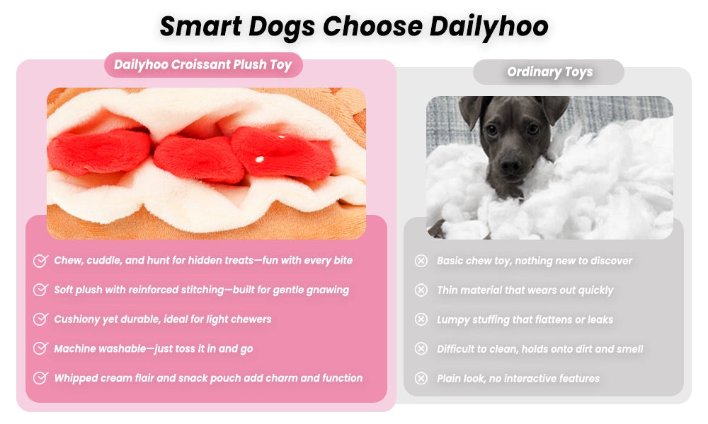 Unlike other plush toys that wear out quickly, this croissant toy features reinforced stitching and durable fabric designed to handle enthusiastic chewing and treat hunting. It’s made to last longer, giving your dog more playtime and you better value.