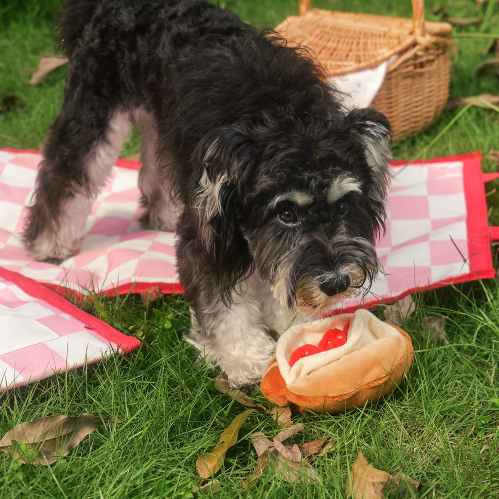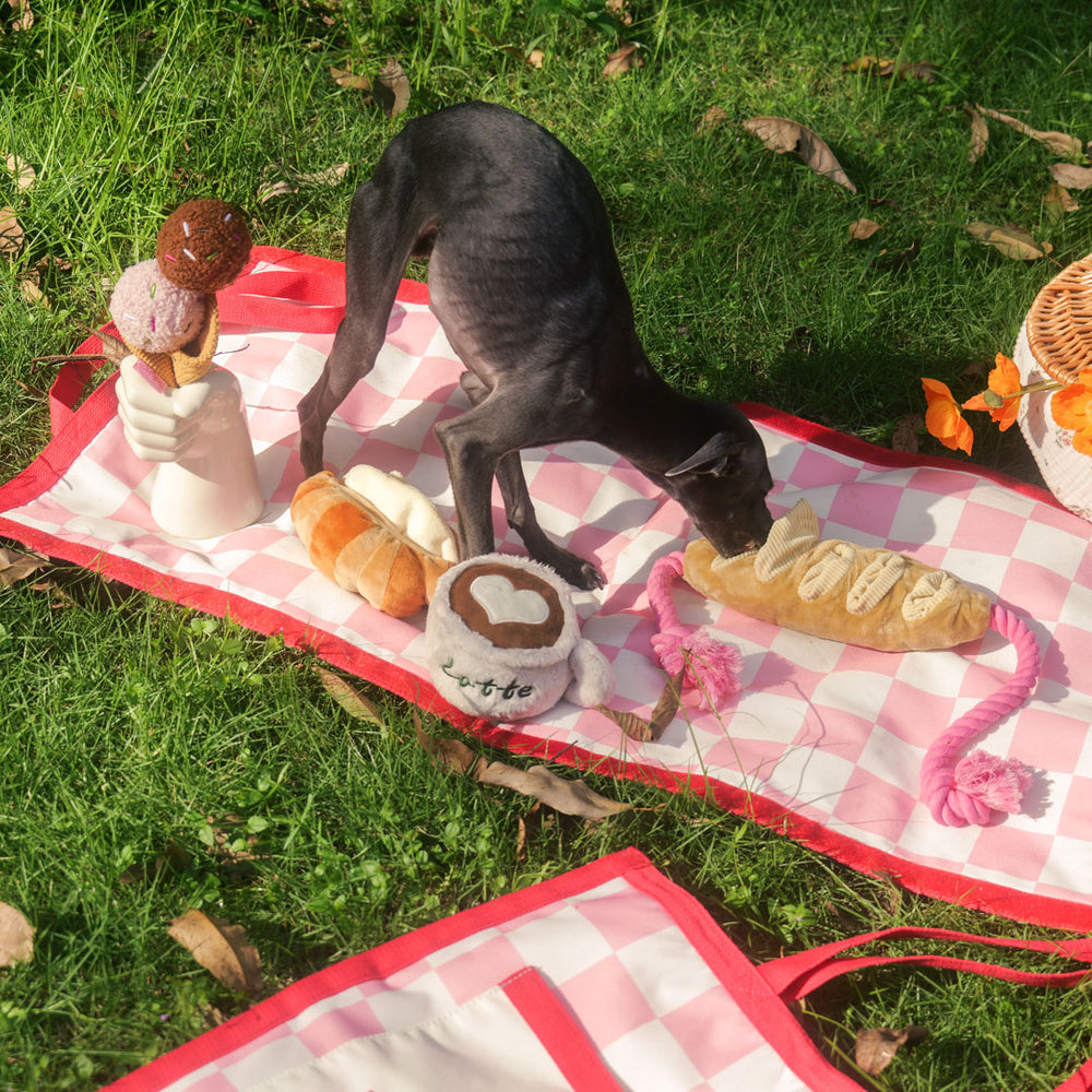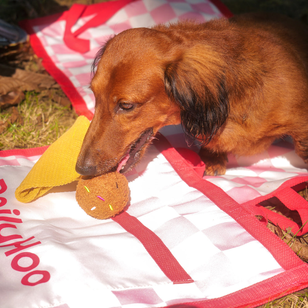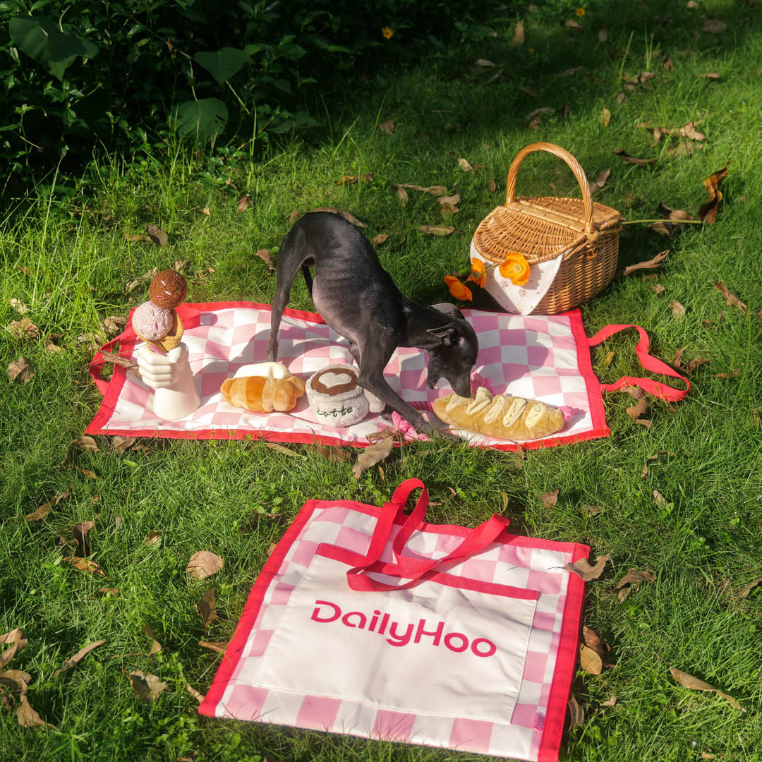 Setup Tips: Unfold the tote into a picnic mat and arrange your pup’s Afternoon Tea Plush Toys — from the Hot Dog and Coffee Cup to the Ice Cream and Croissant — for a playful tea party spread.