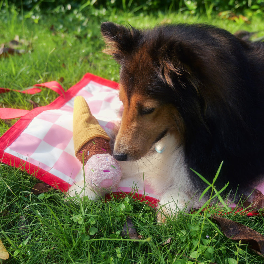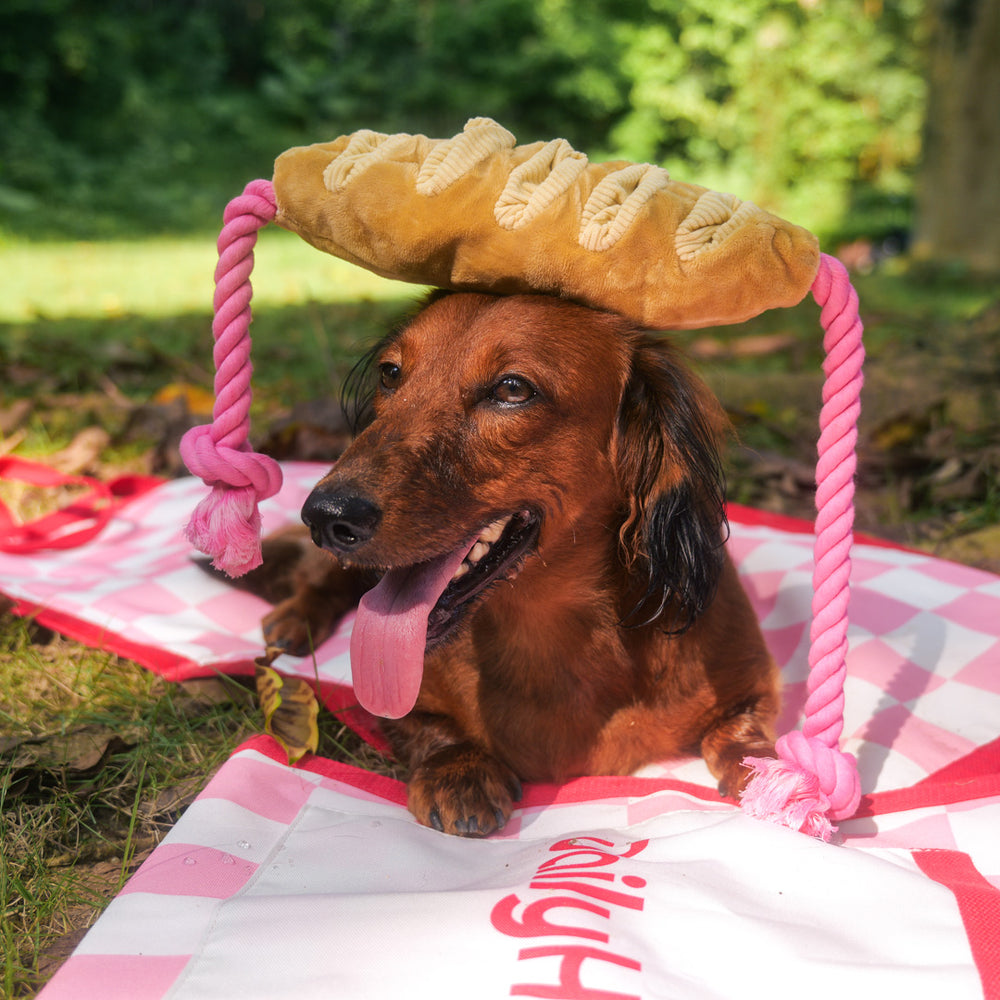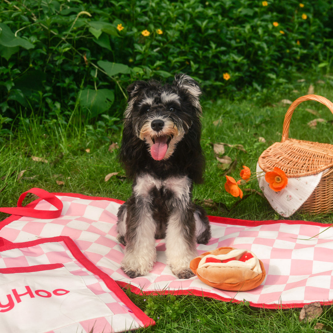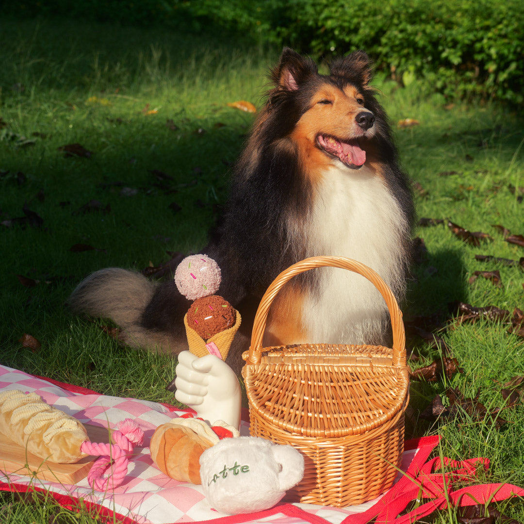 Setup Tips: Unfold the tote into a picnic mat and arrange your pup’s Afternoon Tea Plush Toys — from the Hot Dog and Coffee Cup to the Ice Cream and Croissant — for a playful tea party spread.