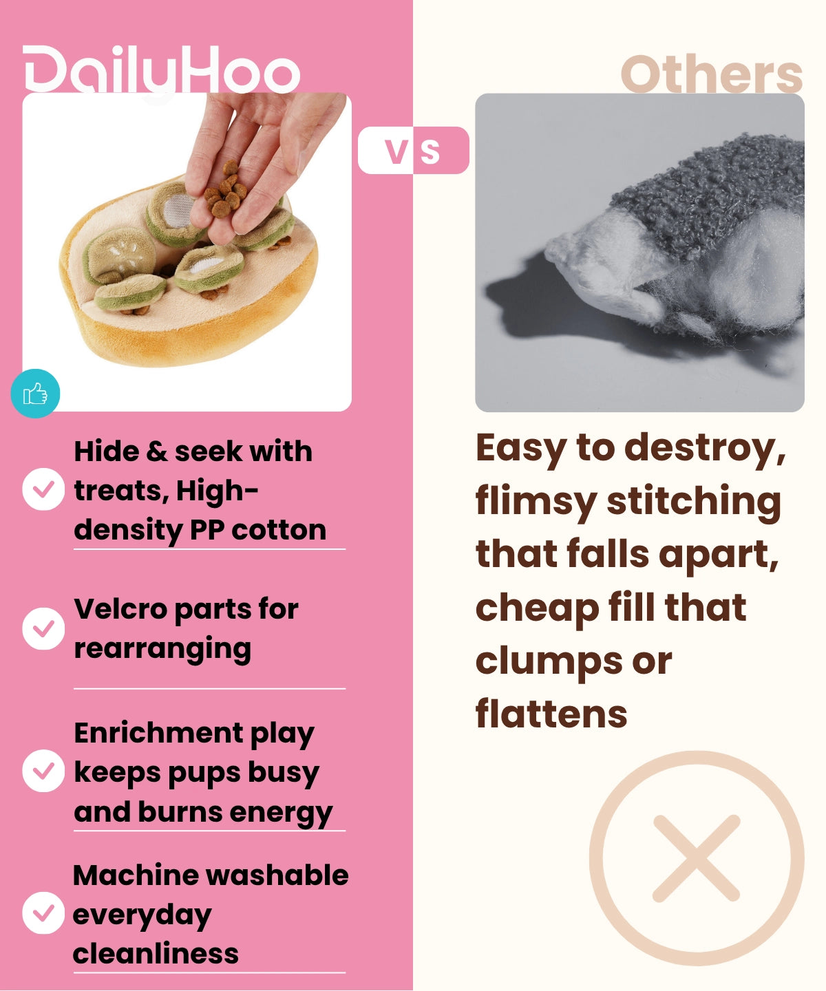 Interactive Treat-Hiding Fun: The bun features detachable sausage and pickle slices with Velcro—perfect for sneaking in your pup’s favorite snacks and keeping their nose and mind engaged.